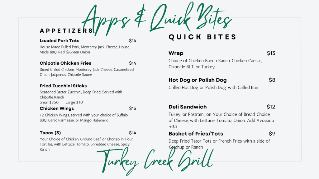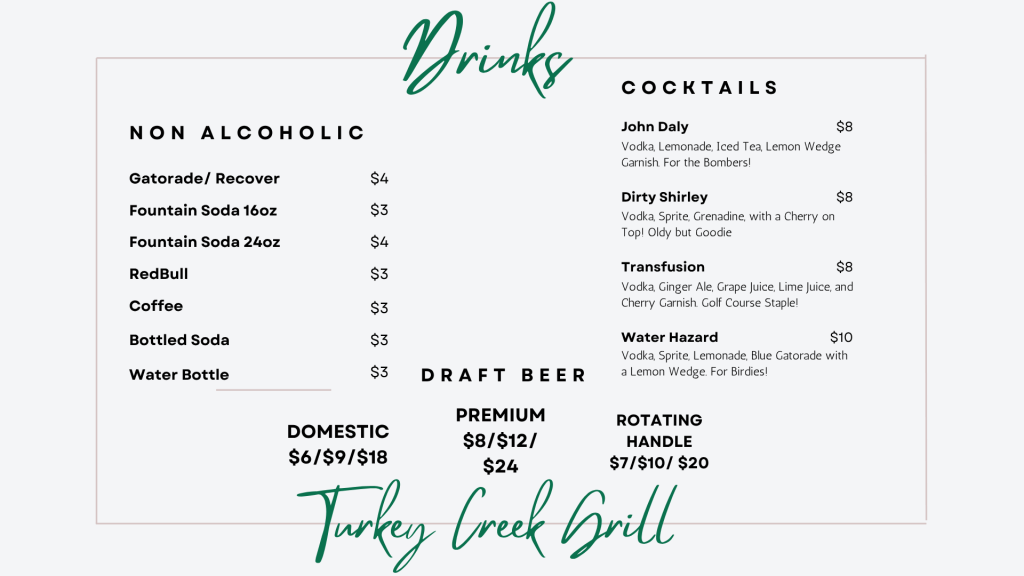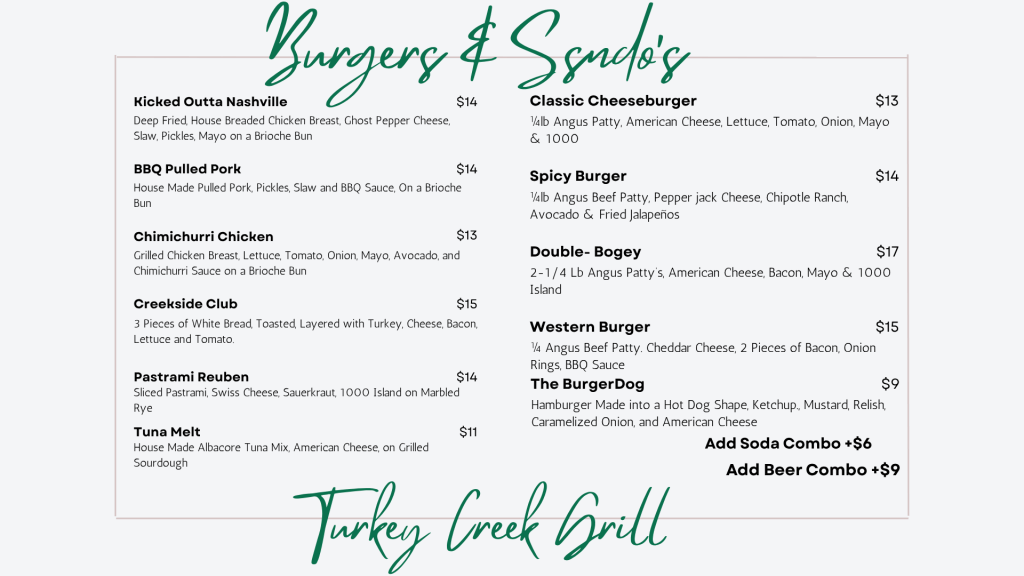 Turkey Creek Bar & Grill is the perfect spot to satisfy your mid and post-round hunger. Choose from our extensive menu of hamburgers, sandwiches and salads, as well as our wide selection of draft and domestic beers.